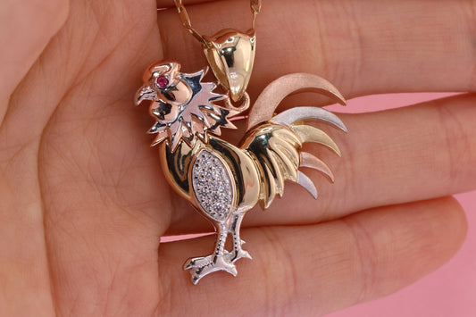 14K Solid Yellow White Rose Gold Cubic Zirconia Rooster Pendant