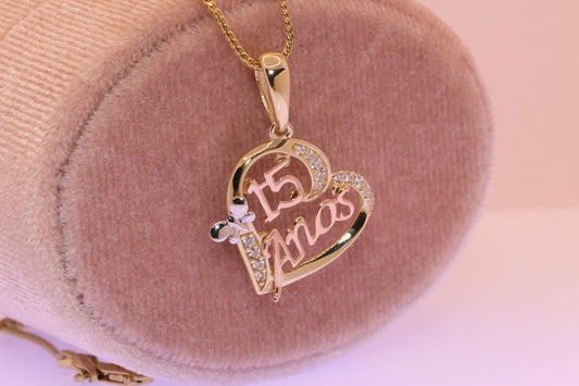 14K Gold 15 Anos Heart Butterfly Quinceanera Pendant