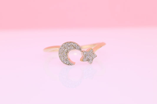 14k Solid Gold Moon Star CZ Ring