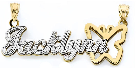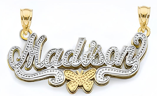 10K or 14K Gold Personalized Double Plate Name Pendant with Butterfly