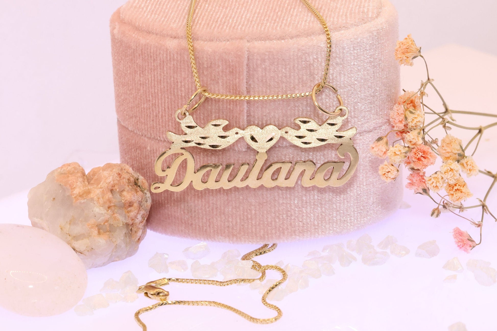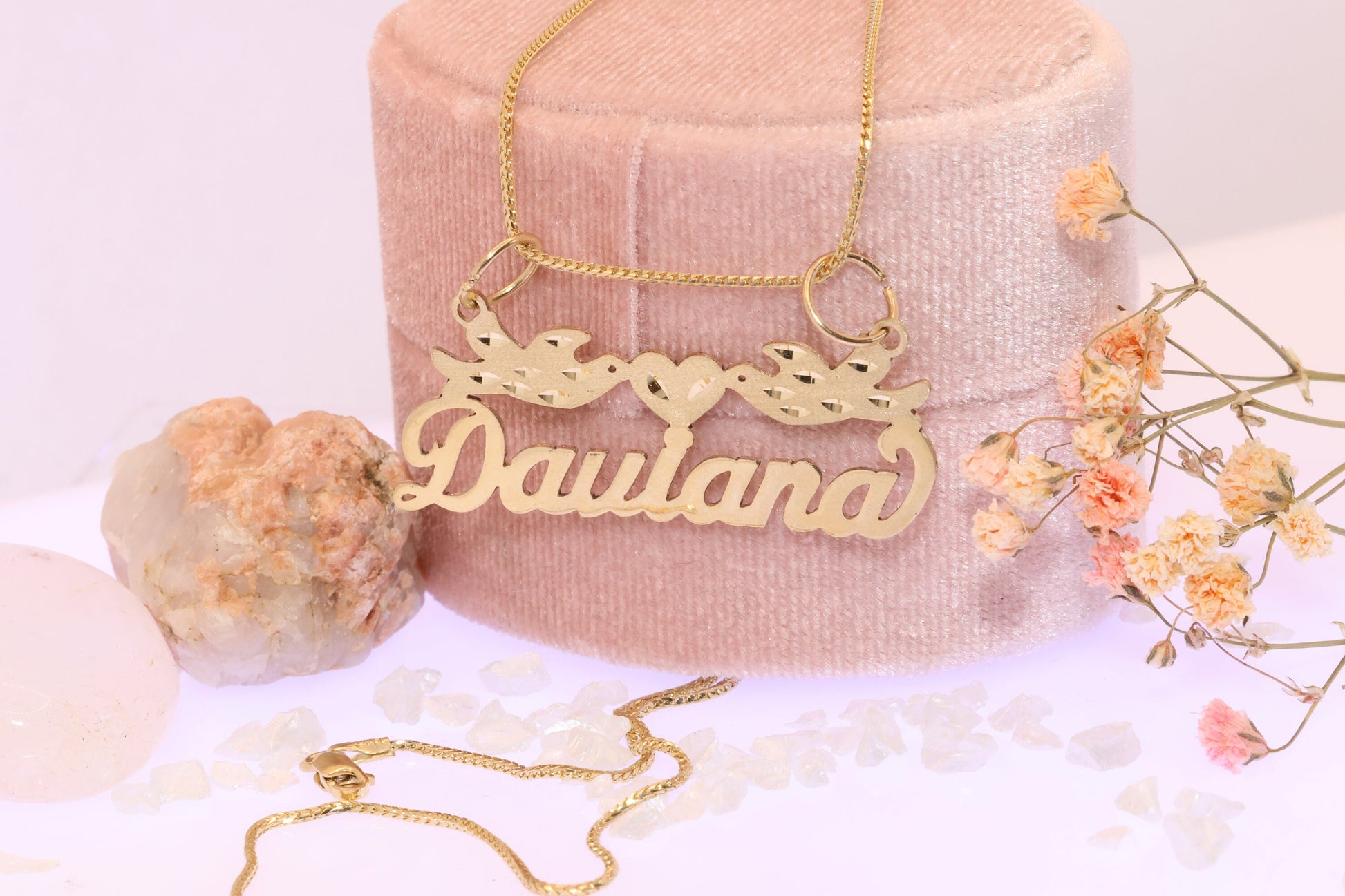 10k 14k Solid Gold Personalized Name Two Birds with Heart Pendant