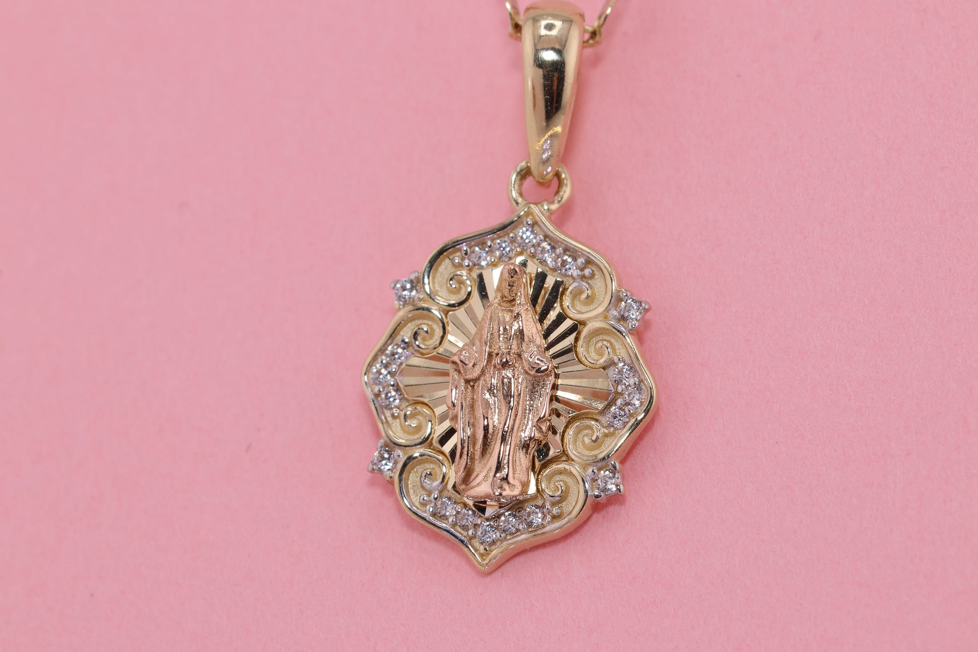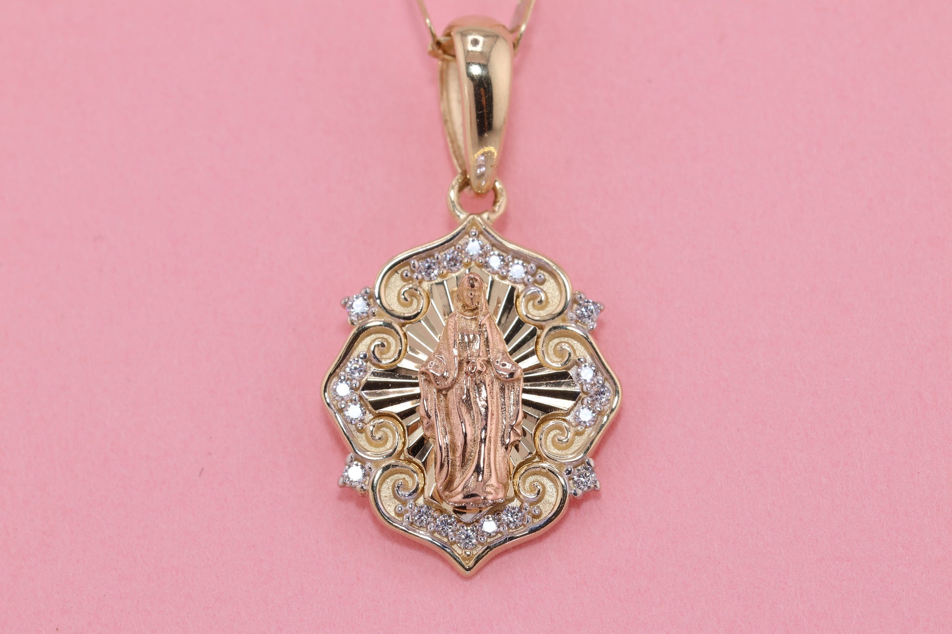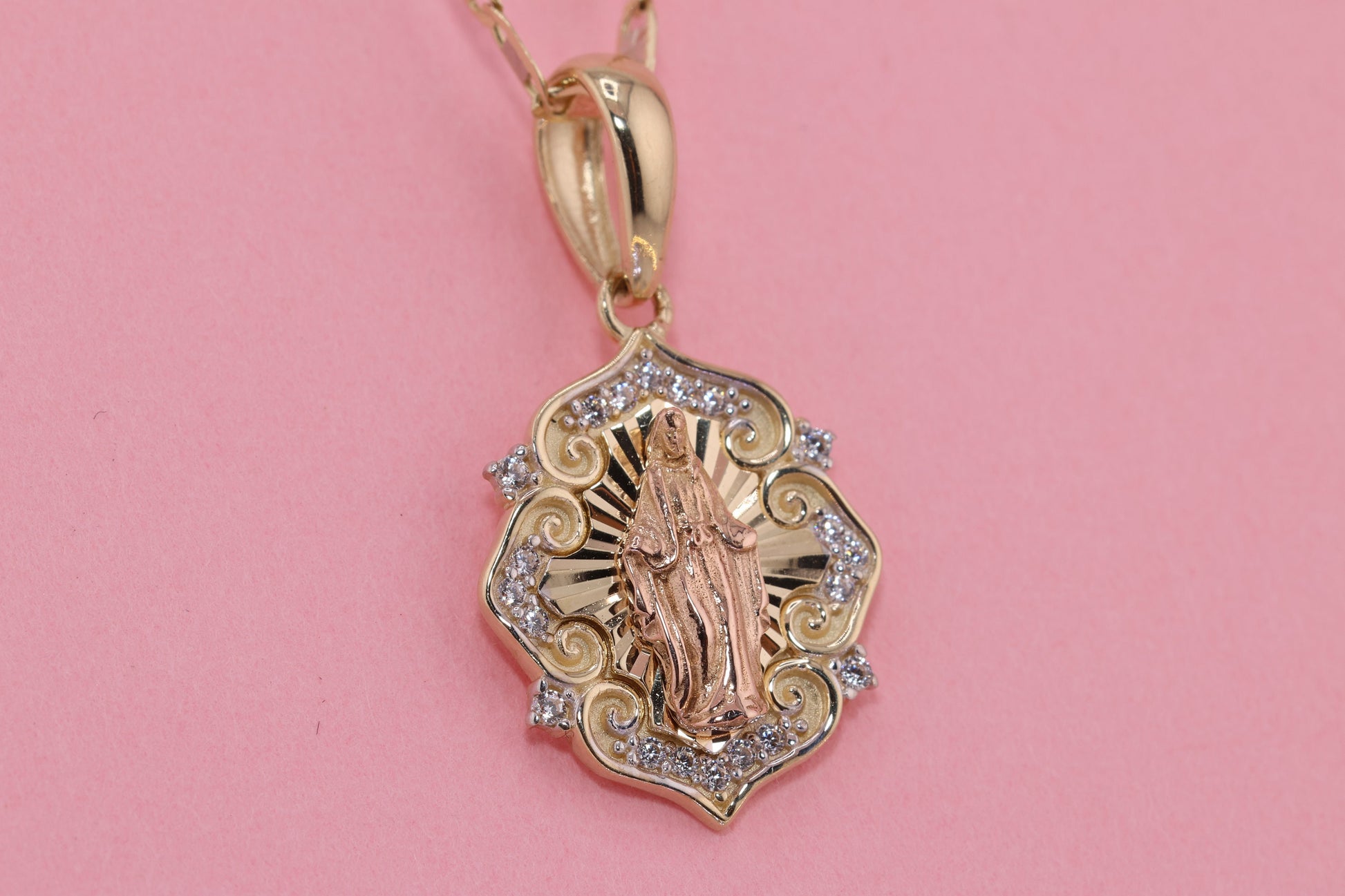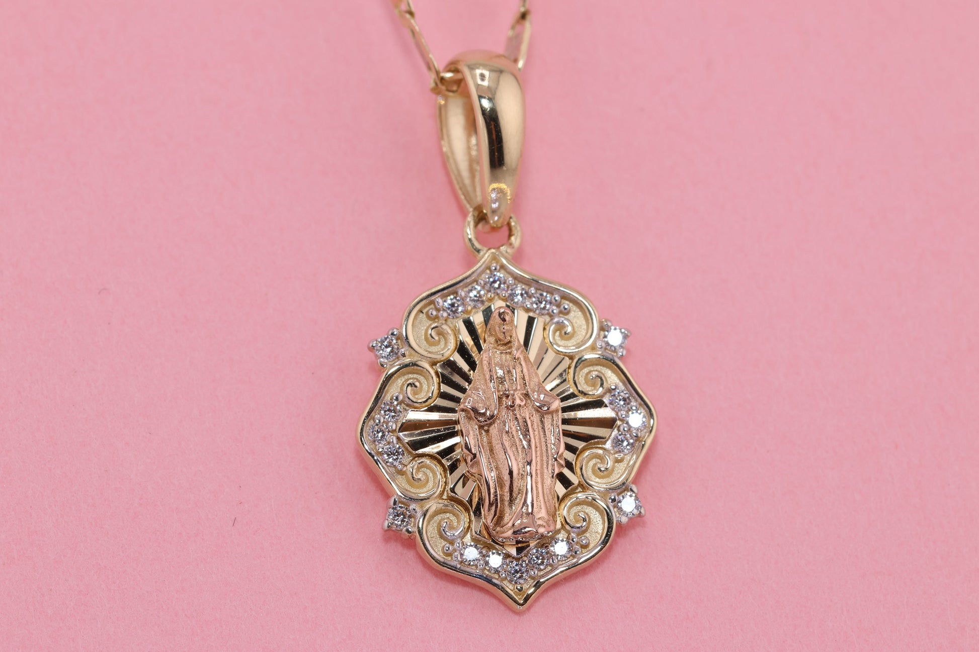 14k Solid Gold Virgin Mary Virgin Maria Lady Guadalupe Heart Pendant B