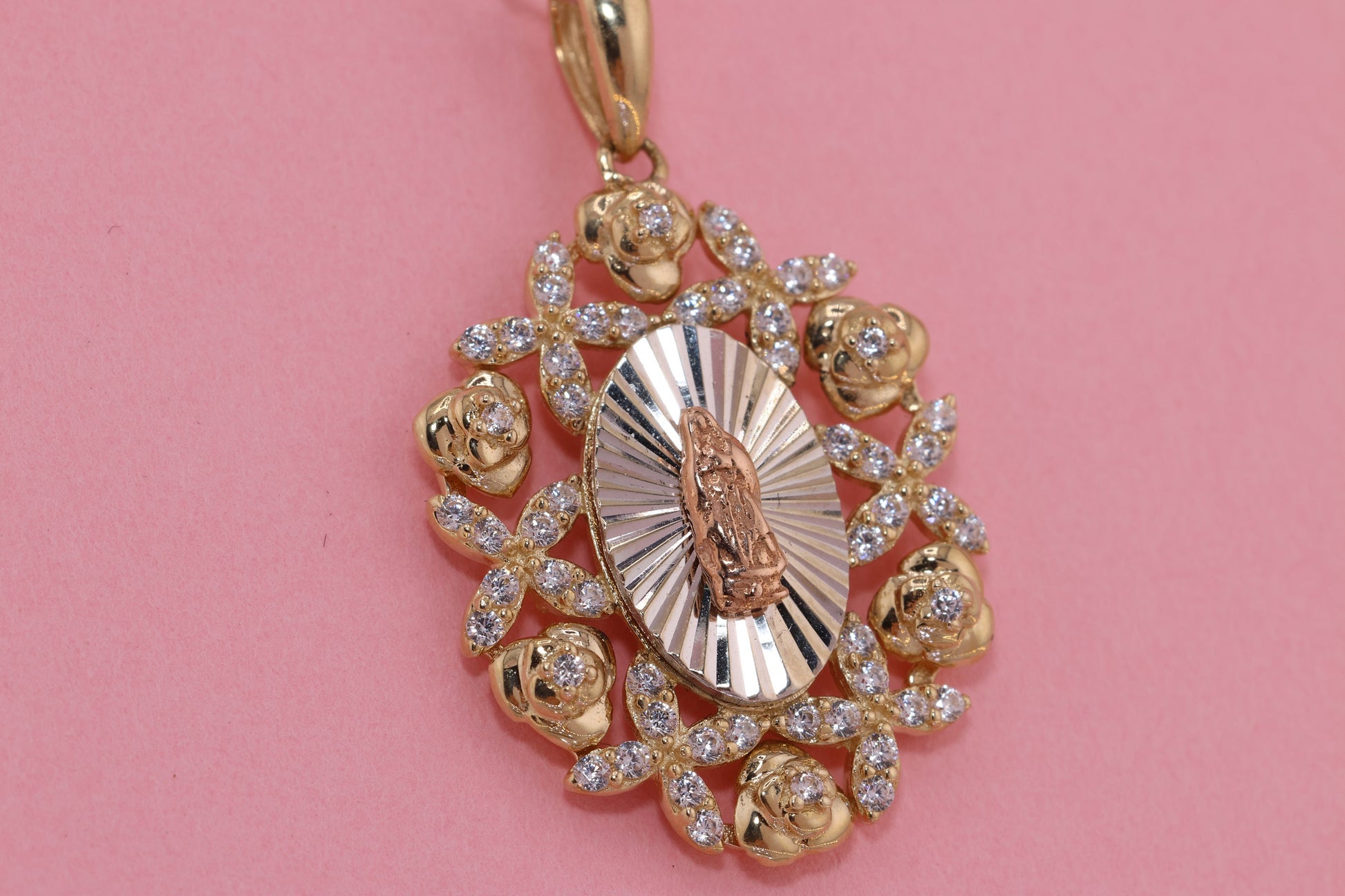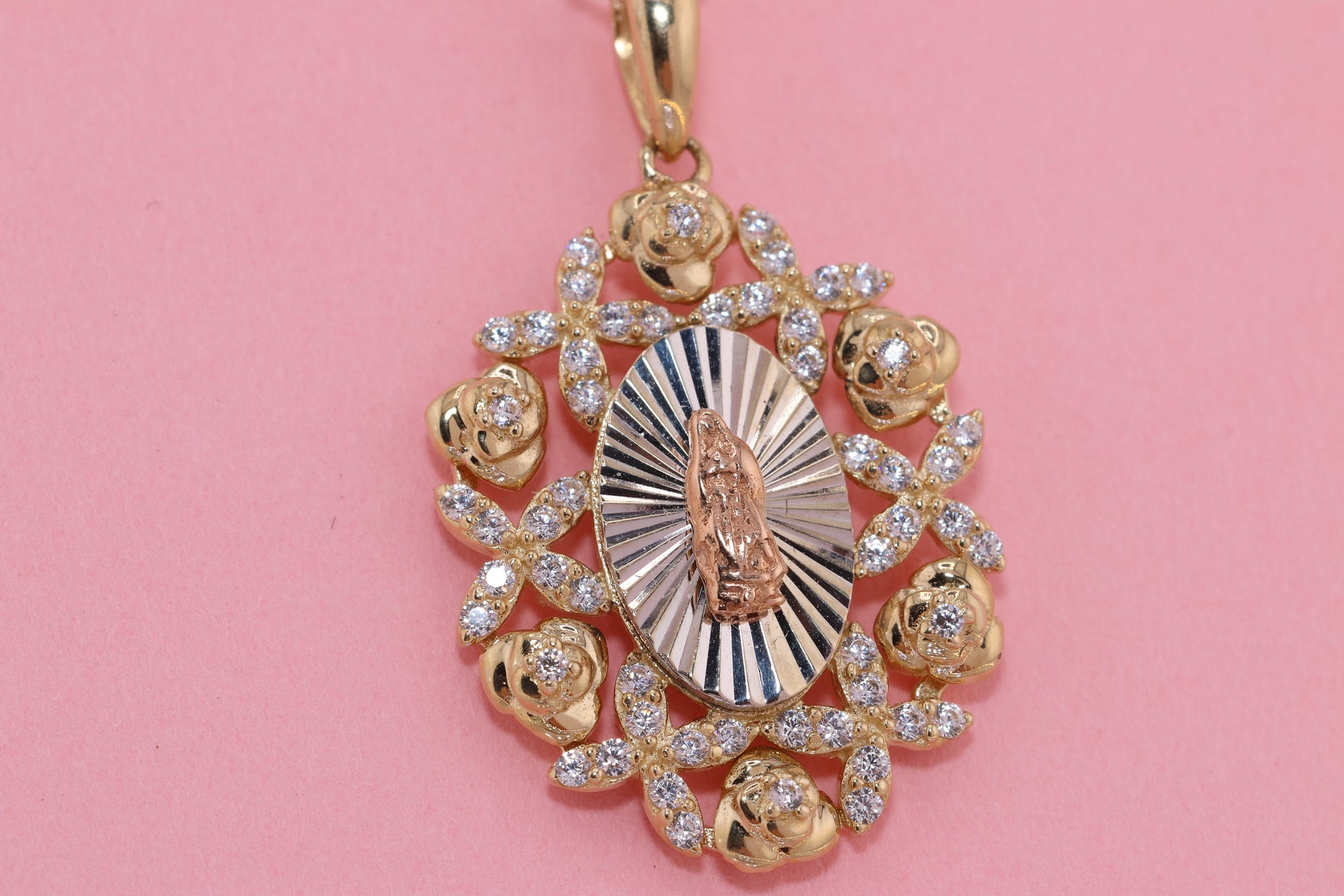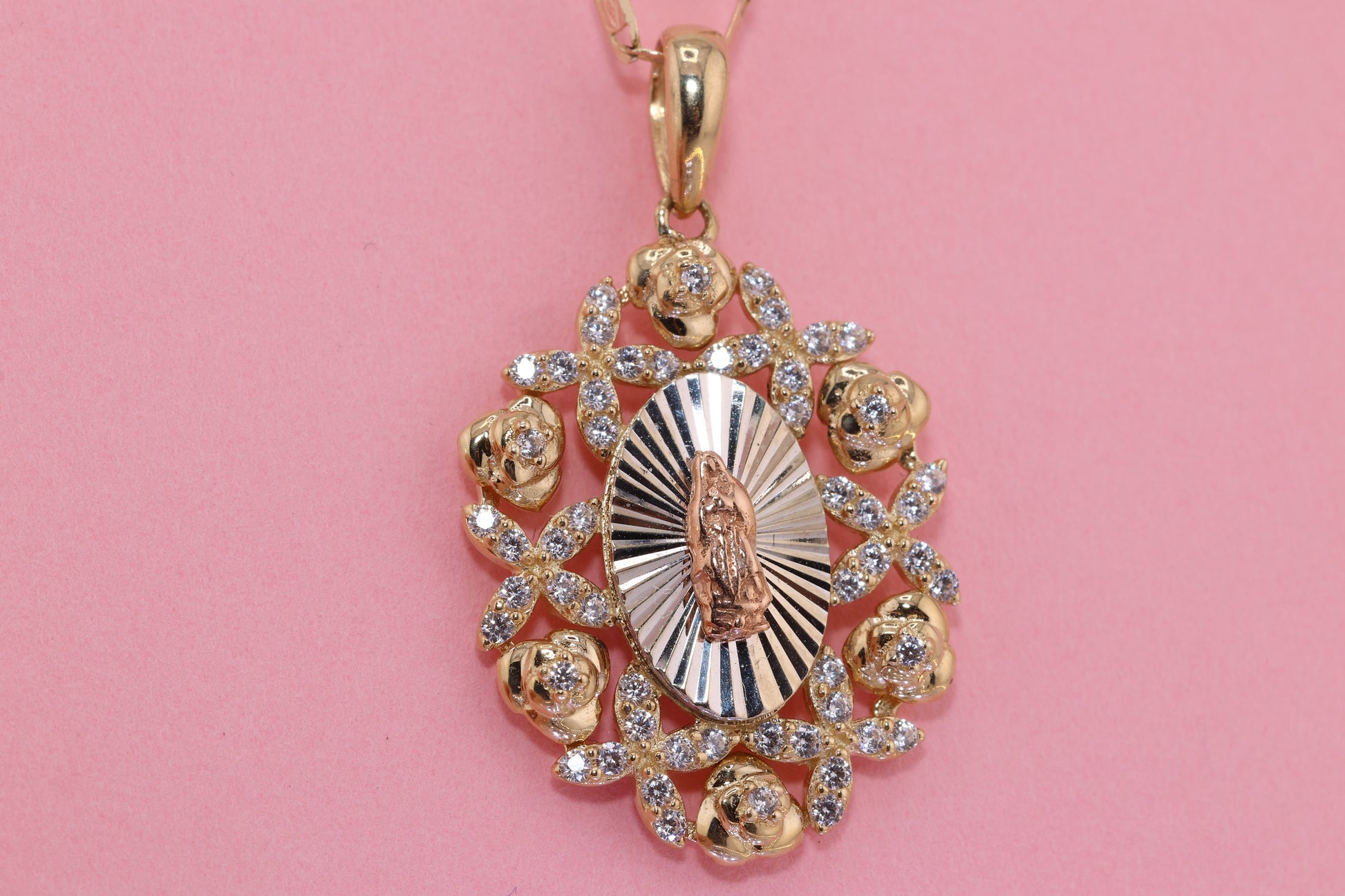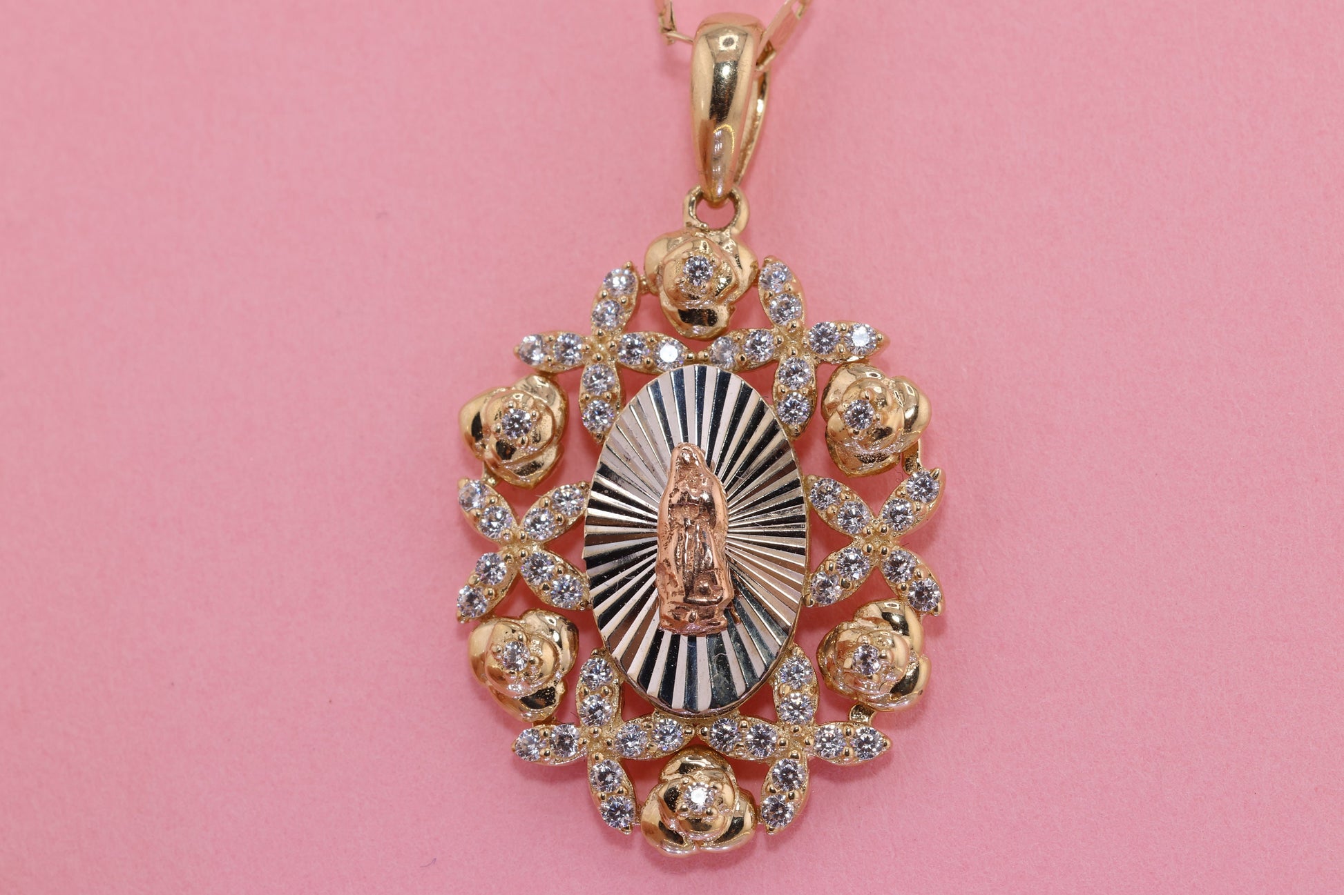 14k Solid Gold Virgin Mary Virgin Maria Lady Guadalupe Heart Pendant C