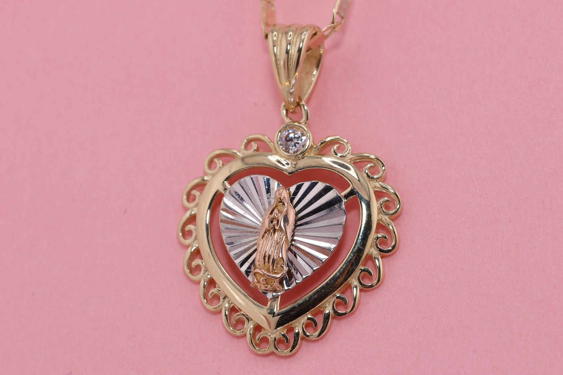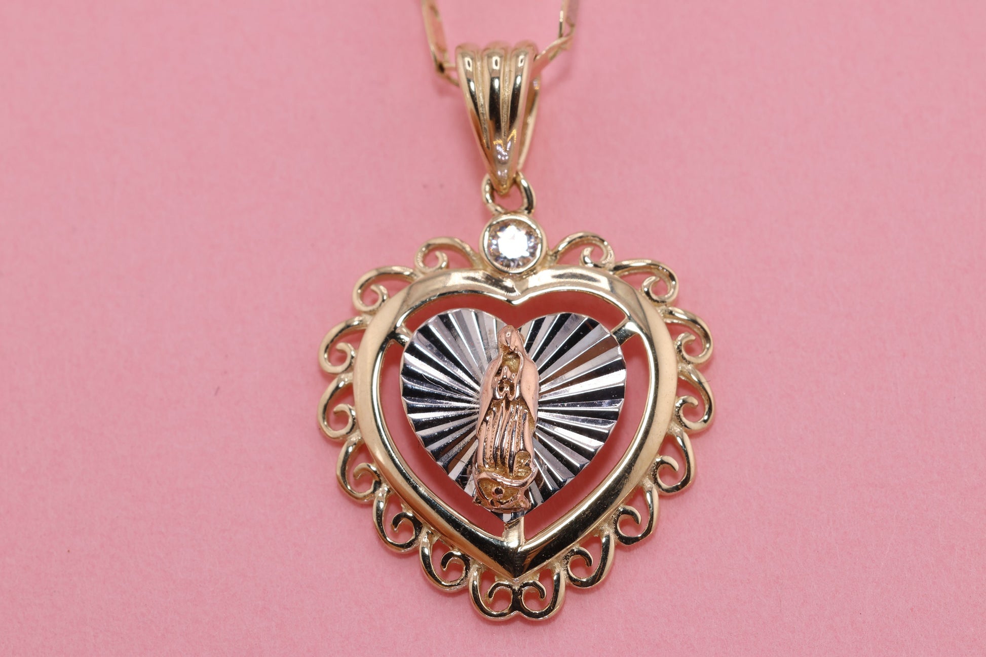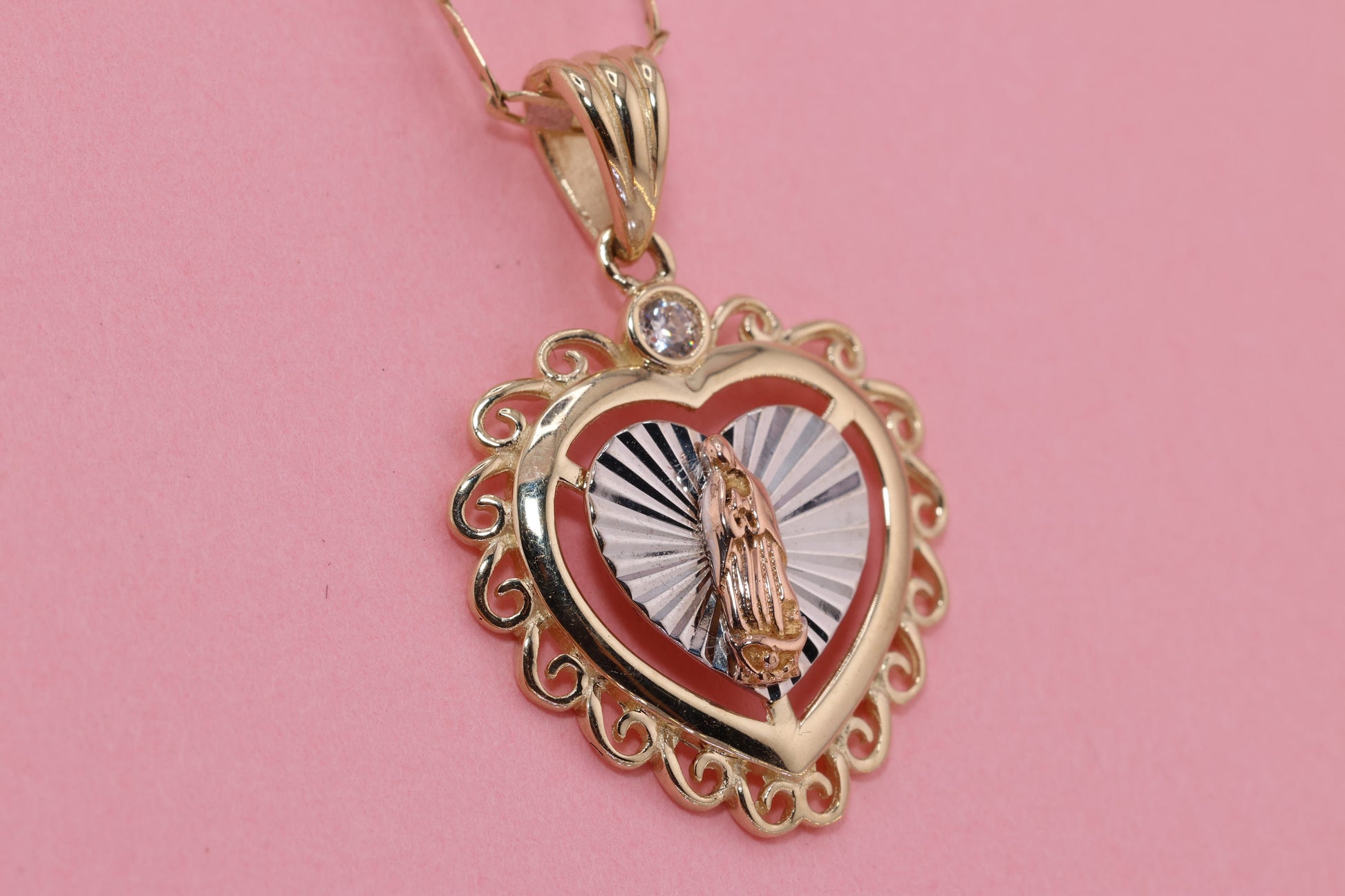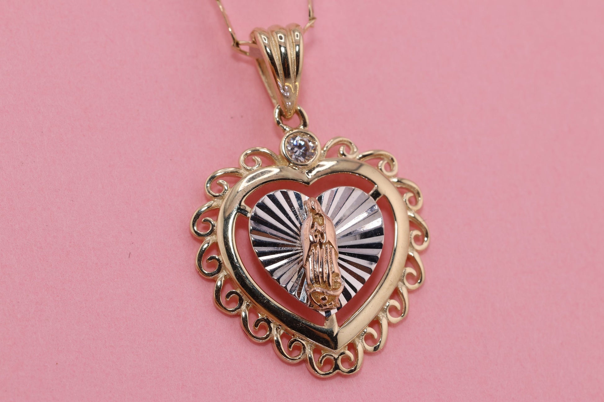 14k Solid Gold Virgin Mary Virgin Maria Lady Guadalupe Heart Pendant G